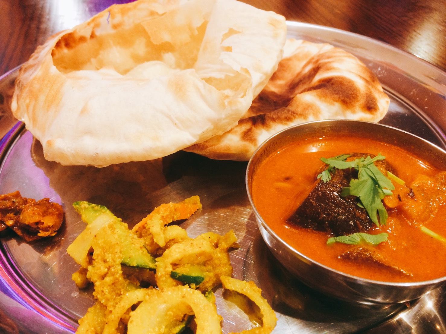 カレーはナスとジャガイモで、ニンニクとクミンが効いたサラサラのカレーです。